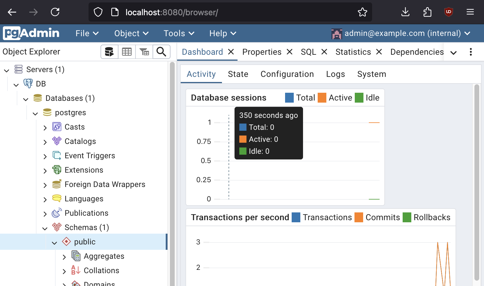 Nun können wir unsere Konfiguration starten. In der Kommandozeile sehen wir auch, dass pgAdmin erst starten, wenn Postgres in den “healthy” Status wechselt. Wenn wir nun die pgAdmin Web-Oberfläche öffnen, gelangen wir direkt, ohne Anmeldung, hinein. Auch der Postgres Server ist für uns bereits konfiguriert.