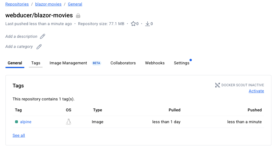 Wir müssen unser Image, das wir veröffentlichen wollen, zuerst nach der obigen Konvention umbenennen. Aus dem aktuellen Namen blazor-movies:from-alpine muss webducer/blazor-moviews:alpine werden (ersetzen Sie Benutzer- und Repository-Namen mit Ihren Werten).
